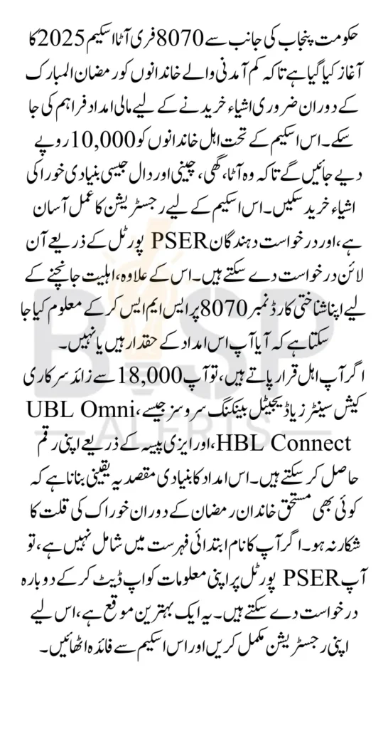 The 8070 Free Atta Scheme is a relief program initiated to support 3 million low-income families in Punjab. The financial aid of Rs. 10,000 will help eligible families buy essential Ramadan items like flour atta sugar, ghee, and pulses. The aim is to ensure that no family struggles for basic food supplies during the holy month.