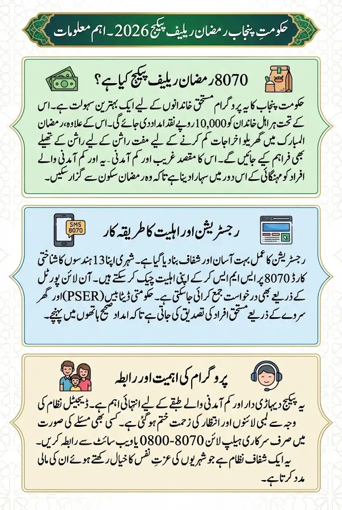 The 8070 Ramzan Relief Package 2026 is a welfare initiative introduced to support financially weak families in Punjab. Unlike previous years where distribution methods were limited, this time the government has introduced a more structured and digital approach. Direct cash transfer and free Rashan distribution are combined so families can manage their expenses according to their needs.