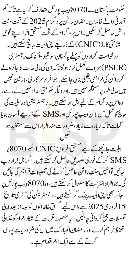 The Ramzan Rashan Program is aimed at supporting people who fall under the low-income category and are unable to meet their daily nutritional needs. The government has designed a simple process for verifying eligibility through the 8070 Web Portal, which allows applicants to check their qualification status using their CNIC Computerized National Identity Card Before checking eligibility, applicants must complete the PSER Pakistan Socio-Economic Registry survey, which collects data about the financial status of individuals to determine whether they qualify for assistance. how to register for the 8070 Web Portal, check eligibility, and receive Muft Rashan through a transparent and efficient process.