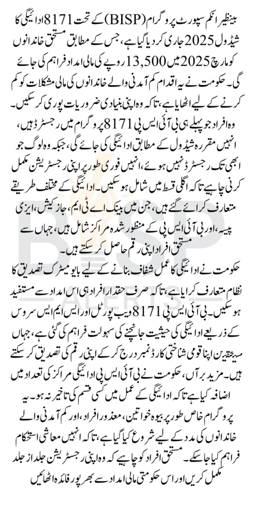 8171 BISP Payment Schedule is a significant initiative by the Government of Pakistan that provides financial aid to low-income families. The government has officially released the BISP 8171 Payment Schedule for 2025, ensuring that all eligible beneficiaries receive their due financial assistance on time. If you are registered under this program, it is essential to stay updated on the payment schedule, eligibility criteria, and payment collection methods to avoid any delays or complications. A new payment schedule has been issued. You can check your eligibility from home according to the payment schedule.