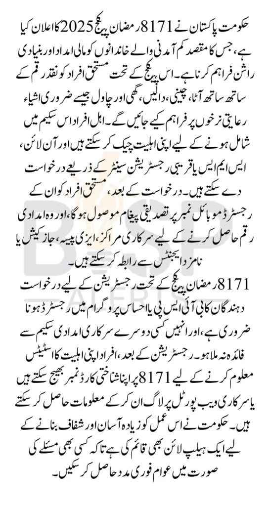 8171 Ramzan Package Check 2026 Online Apply And Eligibility Status Latest Update Government of Pakistan has introduced the 8171 Ramzan Package 2026 to provide financial support and essential ration to low-income families during the holy month of Ramadan. This initiative aims to ease the economic burden by offering cash assistance and subsidized food items to deserving households. Here’s everything you need to know about the online application process, eligibility criteria, and how to check your status for the 8171 Ramzan Package.