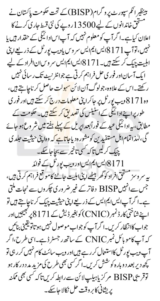 - The 8171 SMS code is used to check BISP eligibility and payment status by sending your CNIC number via SMS.