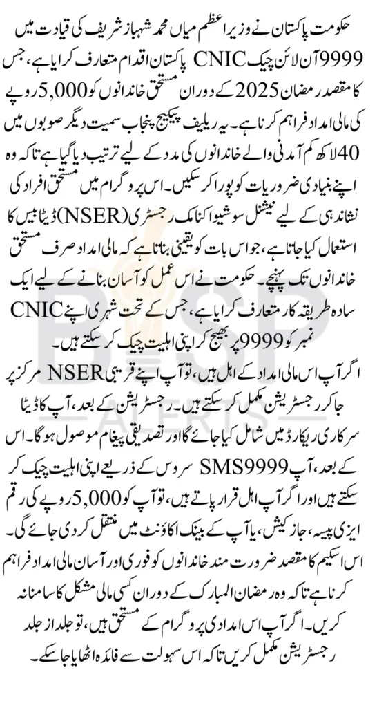 9999 Code For PM Ramzan Package Government of Pakistan, under the leadership of Prime Minister Mian Muhammad Shahbaz Sharif, has launched the 9999 Online Check CNIC Pakistan initiative. This program aims to provide financial assistance of Rs 5,000 to deserving families across Punjab and other provinces during Ramadan 2025.