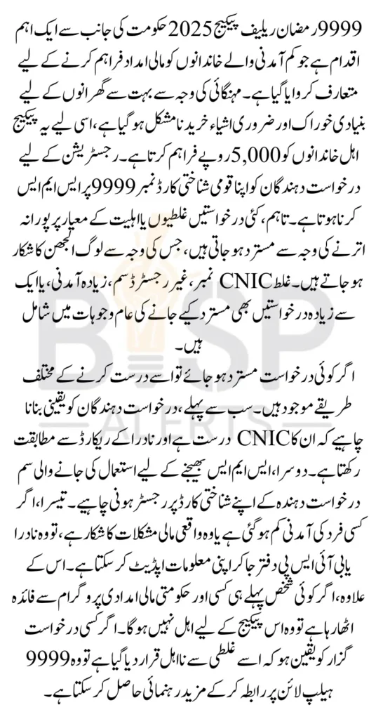 9999 Ramzan Relief Package 2025 is a government initiative designed to support low-income families by providing financial assistance during the holy month of Ramadan. Rising inflation has made it increasingly difficult for many households to afford essential food and groceries, and this program aims to provide relief in the form of PKR 5,000 to eligible families. However, many applicants face rejection due to various reasons, leaving them uncertain about their eligibility.