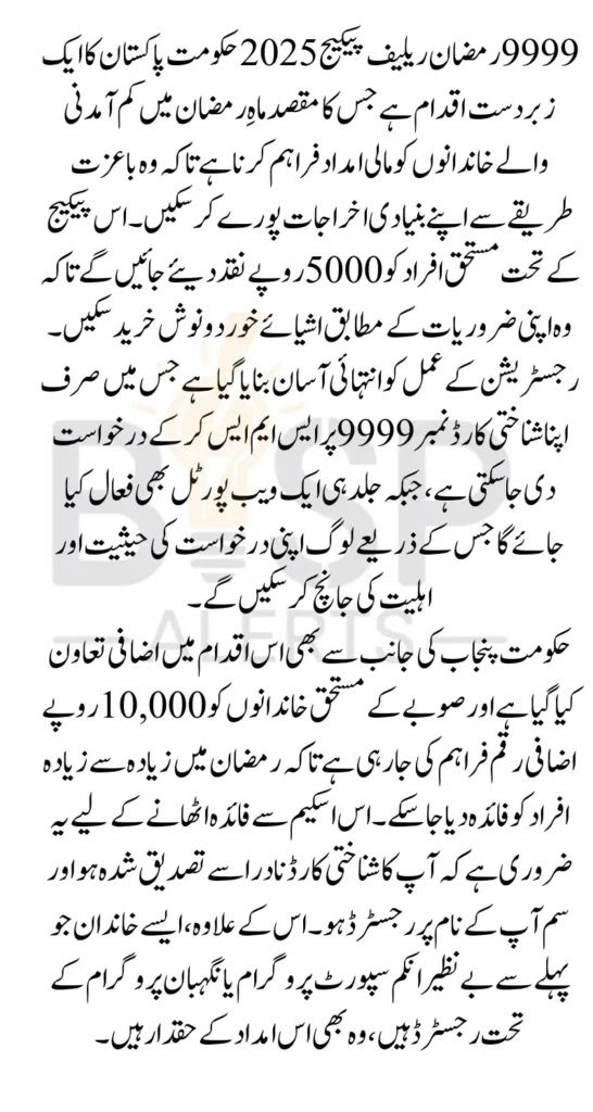 In addition to the federal government’s aid, the Punjab Government is offering an extra PKR 10,000 cash grant to eligible families in the province. This support is provided under a separate provincial program to ensure that the people of Punjab also get maximum help during Ramadan.