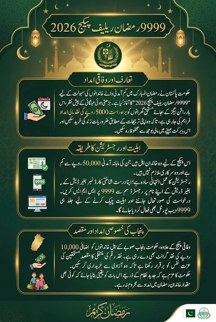 9999 Web Portal Government of Pakistan has officially launched the 9999 Ramzan Relief Package 2026 , designed to support low-income families during the blessed month of Ramadan. With the increasing cost of living, this initiative aims to ease the financial burden by offering direct cash assistance to deserving households. The government has introduced a simple SMS registration system along with a soon-to-be-activated 9999 web portal for checking eligibility and tracking applications. Ramzan Relief Package 2026 , eligibility, registration process, and how you can benefit from this special Ramadan support program.