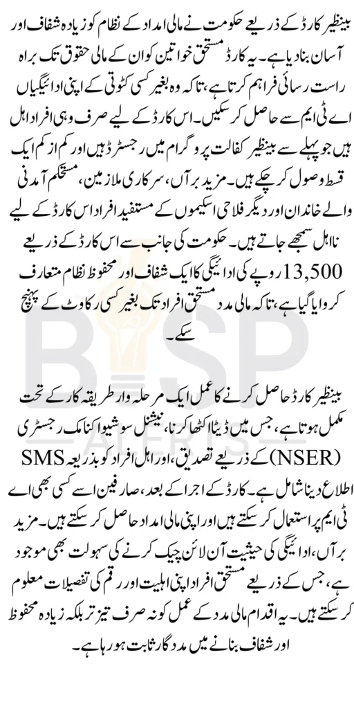Benazir Card Eligibility is an important initiative aimed at making financial assistance easily accessible, secure, and efficient for low-income families, particularly women. Through this program, eligible beneficiaries can withdraw their 13500 payments without middlemen interference, ensuring full access to government aid.