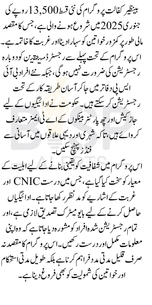 The Benazir Kafaalat 13500 installment is a significant step forward in the government’s efforts to support vulnerable families. With streamlined processes, enhanced payment methods, and robust support systems, the program ensures that eligible individuals receive timely assistance. Whether you are an existing beneficiary or a new applicant, staying informed and following the outlined steps will ensure a hassle-free experience in receiving your funds.