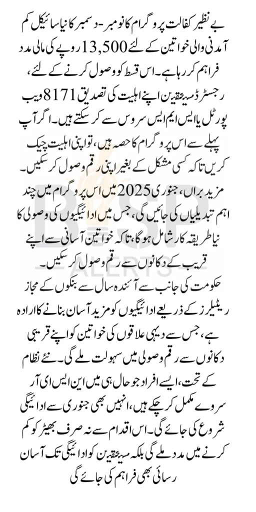 Starting in January 2025, the Benazir Kafaalat Program will introduce some important changes to improve the experience for beneficiaries. The new cycle will continue providing 13,500 in financial aid to eligible women, ensuring consistent support. Women who recently completed the NSER survey but have not yet received payments will also begin receiving funds starting in January.
