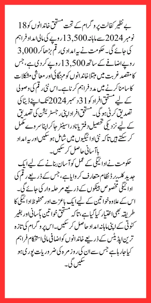 Benazir Kafalat 13500 Latest Payment Disbursement is set to bring essential financial relief to registered and eligible families across Pakistan. Starting November 18, 2024, the monthly payment will increase by 3,000 PKR, bringing the total assistance to 13500 . This increase aims to support families facing rising living costs and economic challenges. Below, we outline all the details you need to know about the payment disbursement, eligibility requirements, and how to ensure your registration is complete.