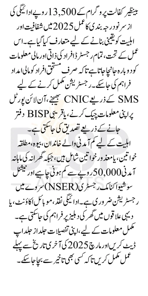 Benazir Kafalat 13500 Payment Reclassification In 2025, the program has introduced a 13500 payment to eligible individuals, ensuring they have the resources to cover basic living expenses. However, before receiving this payment, individuals must go through the reclassification process to confirm their eligibility.