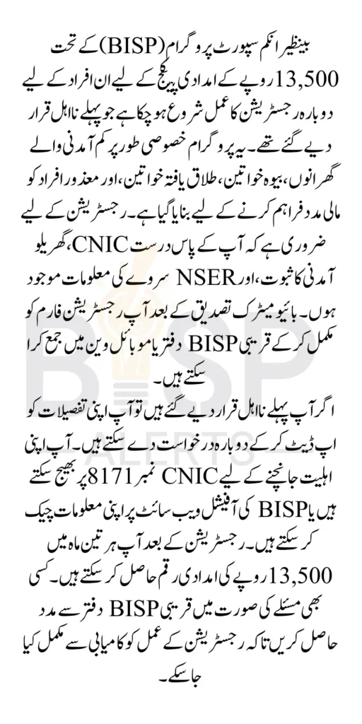 BISP 13500 Ineligibility Registration Form If you are a woman who was previously ineligible for the Benazir Income Support Program, now is the time to take action. Re-registering for the program could provide you with much-needed financial support to meet your basic needs. Follow the steps outlined in this guide, gather the required documents, and ensure your NSER survey is complete. Once you meet the eligibility criteria, you can reapply and start receiving the 13,500 PKR assistance to help you and your family.