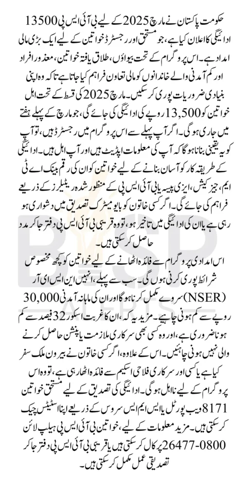 The Government of Pakistan has confirmed that the BISP 13500 payment will be distributed in March 2025 to all registered and eligible women. The installment aims to provide financial relief to those facing economic hardship.
