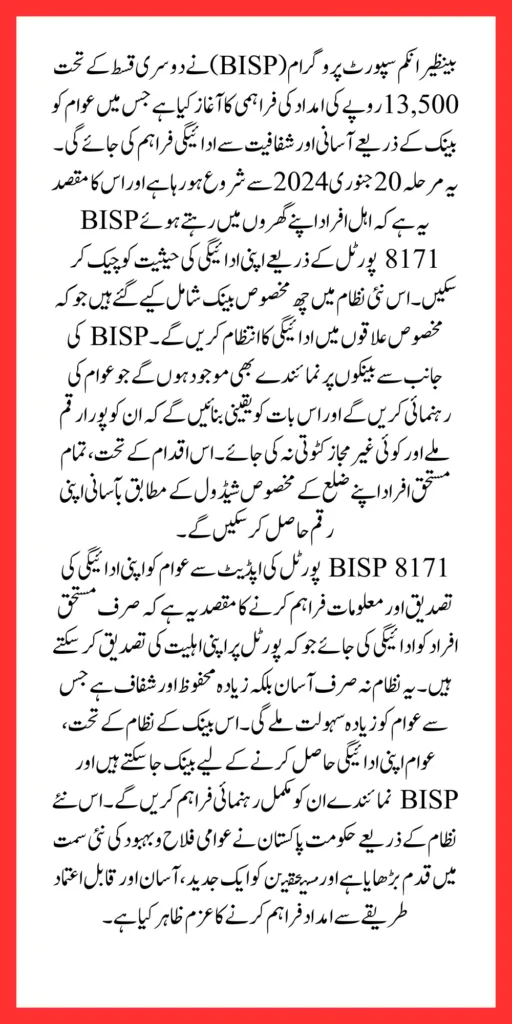 BISP 13500 Rupee Payment Phase 2 The Benazir Income Support Program is introducing the second phase of its 13,500 rupee assistance payments, providing essential support to low-income families across Pakistan. Starting on January 20, 2024, this phase will use a new bank-based distribution system to make the process smoother, more transparent, and accessible. With the updated BISP 8171 web portal, eligible individuals can now check their payment status from the comfort of their homes. Here’s everything you need to know about how the bank-based system will work and what steps you need to follow.