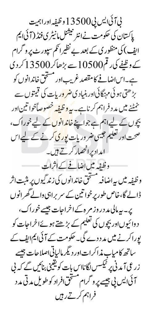 This increase in the stipend will have a direct and positive impact on the lives of BISP beneficiaries. The financial aid will help reduce the financial burden on women-headed households and other vulnerable groups who rely on this support to make ends meet. The increase from 10500 to 13500 will help beneficiaries cover the growing costs of everyday essentials, including food, medicine, and education for children.