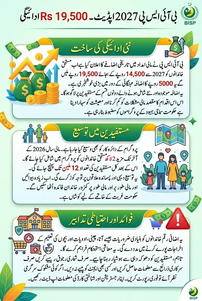 BISP 2027 Update government has announced a major update in the Benazir Income Support Program (BISP), bringing relief to millions of struggling families across Pakistan. According to the latest decision, the financial assistance amount will be increased to Rs 19,500 starting from January 2027. This development is being seen as a much-needed step at a time when inflation continues to affect the daily lives of ordinary citizens.
