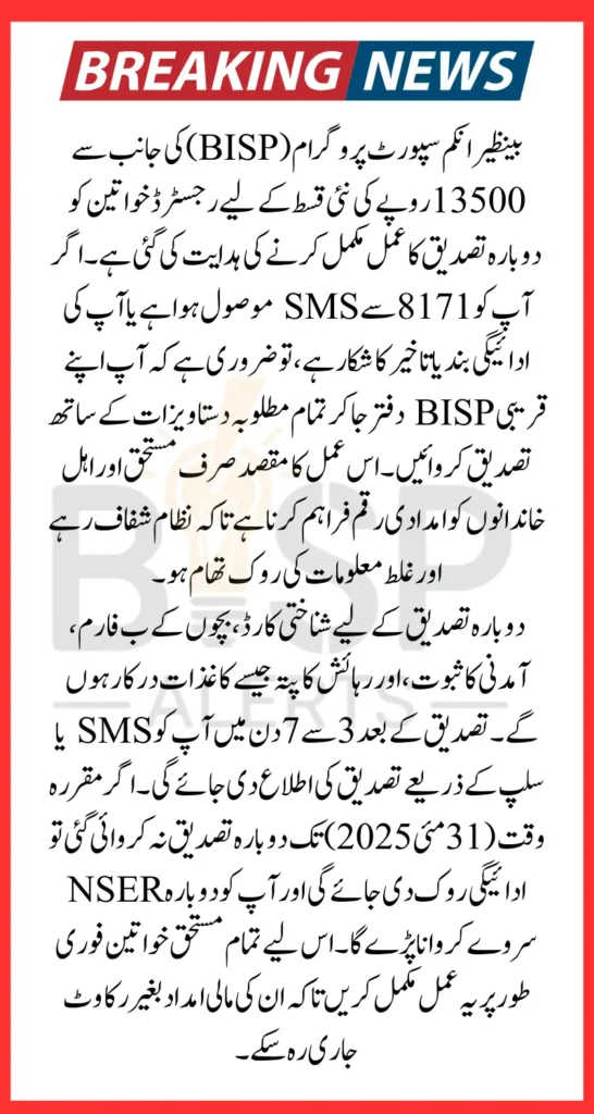 If you’re a registered woman under the BISP 8171 program and want to receive your Rs. 13,500 payment without interruption, don’t ignore the reverification notice. Gather your documents, visit your nearest BISP office, and update your records before May 31, 2025.