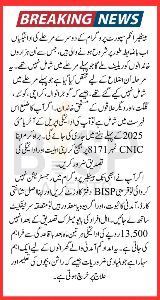 The launch of the BISP 8171 Second Phase brings a much-needed update for thousands of deserving families waiting for their Rs. 13,500 installment. With an official start date confirmed for late April or early May 2025, it’s now crucial to check your district’s inclusion, confirm your payment status, and follow the correct process for collection. Stay connected with the official BISP channels, avoid relying on middlemen, and act on time to secure your rightful support.