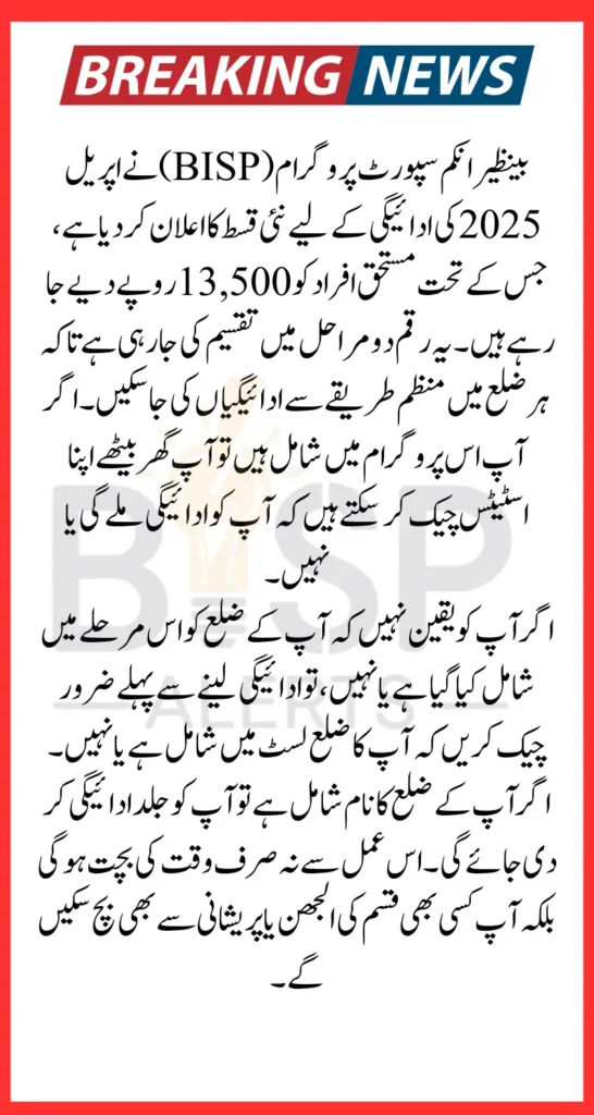 BISP has issued a new payment schedule for Rs. 13,500. Under this updated plan, beneficiaries can now check their payment status from the comfort of their home. The process also allows individuals to confirm whether they have been included in the program or not. If your name is on the list and you’re eligible, you will be able to receive the payment directly without visiting an office.