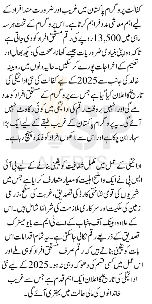 BISP Kafaalat Bank Withdrawal 2025 Payment The BISP Kafaalat program is an essential tool in the fight against poverty in Pakistan. By providing quarterly payments of Rs. 13,500 to eligible individuals, the program plays a vital role in helping families meet their basic needs and improve their quality of life. With the announcement of the new payment schedule by Rubina Khalid, beneficiaries can now plan ahead and ensure that they do not miss out on this important financial support.