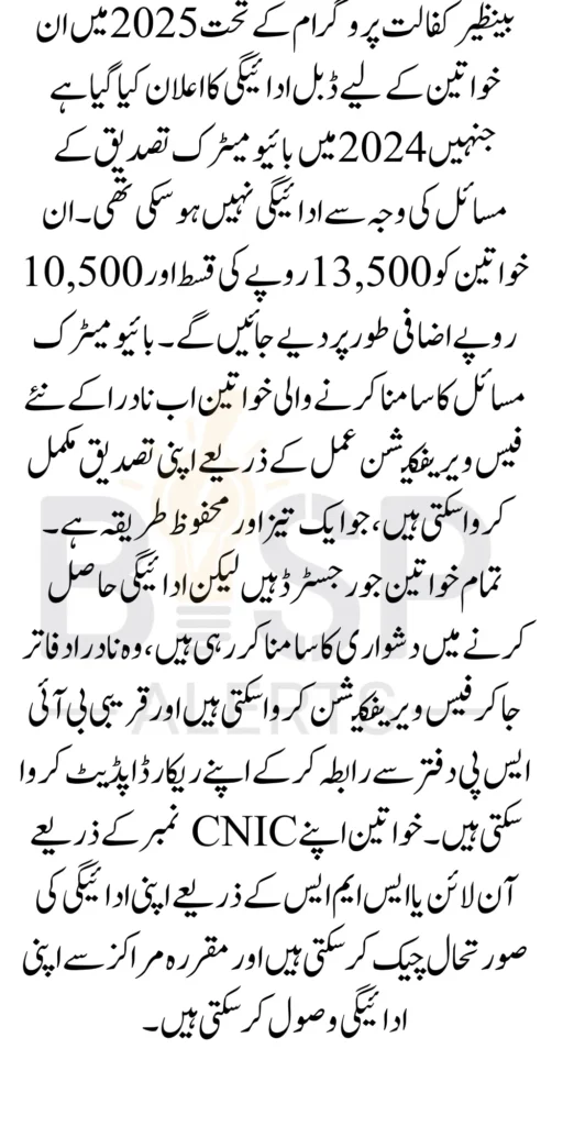 The recent BISP notification confirms that eligible beneficiaries will receive double payments of 13,500 and Rs. 10,500 in 2025. This double payment is specifically for women who had completed their registration but did not receive any payments due to fingerprint verification problems. This policy ensures that previously overlooked beneficiaries can now access their rightful payments without unnecessary delays.