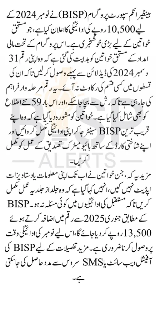 The BISP has announced December 31, 2024, as the final deadline to collect your Rs. 10,500 payment. Women who fail to collect their payments by this date may face interruptions in their financial assistance.