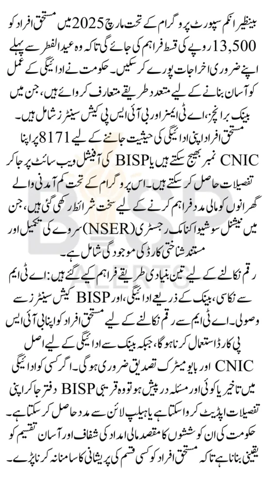 The Benazir Income Support Program BISP 13500 payment is a major financial relief initiative for low-income families in Pakistan. The government has ensured that payments are distributed transparently and efficiently through multiple channels. Eligible beneficiaries can check their payment status online via the web portal or SMS and withdraw their funds through ATMs, bank branches, or BISP payment centers. Individuals who have not yet received their payments are advised to check their eligibility regularly and ensure their NSER survey is updated to continue receiving financial assistance. For further details, beneficiaries can visit the BISP official website or contact the BISP helpline