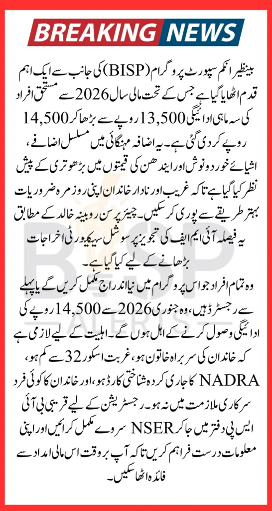 BISP Payment Increase 2026 Government of Pakistan has officially announced an increase in the BISP quarterly payment from Rs. 13,500 to Rs. 14,500 for the financial year 2026. This change will bring much-needed relief to millions of low-income families across the country who rely on this assistance to meet their basic needs. With inflation steadily rising and prices of daily commodities increasing, the government aims to ensure that vulnerable segments of society are not left behind.