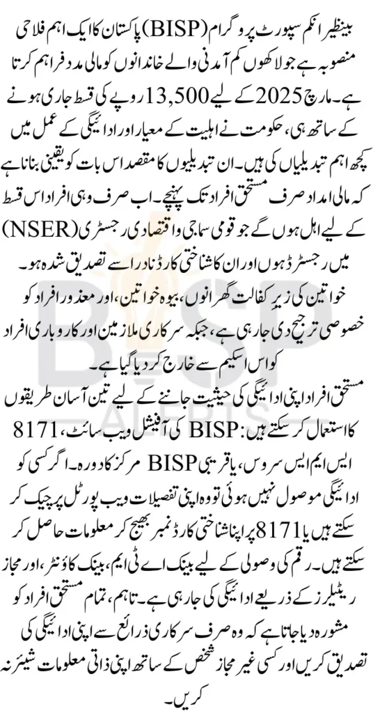 BISP Payment March 2025 Eligibility With the release of the BISP Rs. 13,500 payment for March 2025, several changes have been made to the eligibility criteria and payment process. Understanding these updates is essential for beneficiaries to ensure they receive their financial assistance without any issues. latest eligibility changes, payment methods, how to check your status, and solutions to common issues. If you are a BISP beneficiary, read on to stay informed and ensure that you receive your payment smoothly.