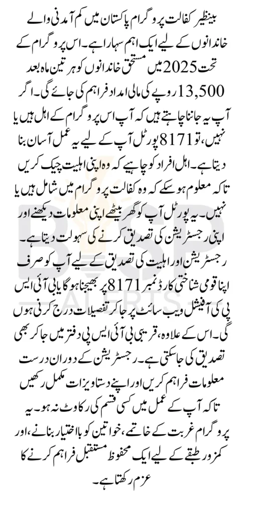 The Benazir Kafalat Payment of Rs. 13,500 in 2025 is a vital support system for families in need. By using the 8171 portal or visiting the official BISP website, you can easily check your eligibility and complete your registration. Don’t miss out on this opportunity to secure financial assistance for a better future. Stay informed through official resources and act quickly to claim your benefits.
