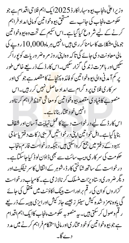 CM Punjab Bewa Sahara Card Punjab Government has launched the CM Punjab Bewa Sahara Card 2026 to provide financial support to widows across the province. This initiative, introduced under the leadership of Chief Minister Maryam Nawaz Sharif, aims to help widowed women who are struggling financially after the loss of their husbands. Through this program, eligible widows will receive a monthly stipend of Rs 10,000, ensuring they can meet their daily needs and live with dignity.