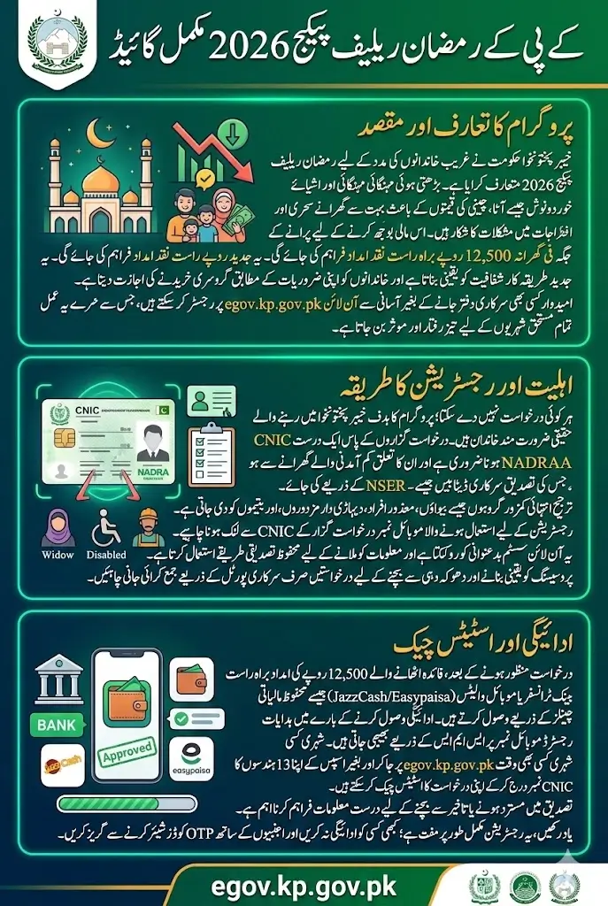 Egov.kp.gov.pk Ramzan Relief Package Government of Khyber Pakhtunkhwa has launched the Ramzan Relief Package 2026 to support low-income families during the holy month. In Pakistan, Ramadan is a time when household spending increases significantly because families prepare meals for Sehri and Iftar every day. With inflation continuing to affect the prices of flour, sugar, cooking oil, and other essential food items, many households struggle to manage these additional expenses. To reduce this financial burden, the provincial government has introduced a financial assistance program that provides Rs. 12,500 to eligible families.