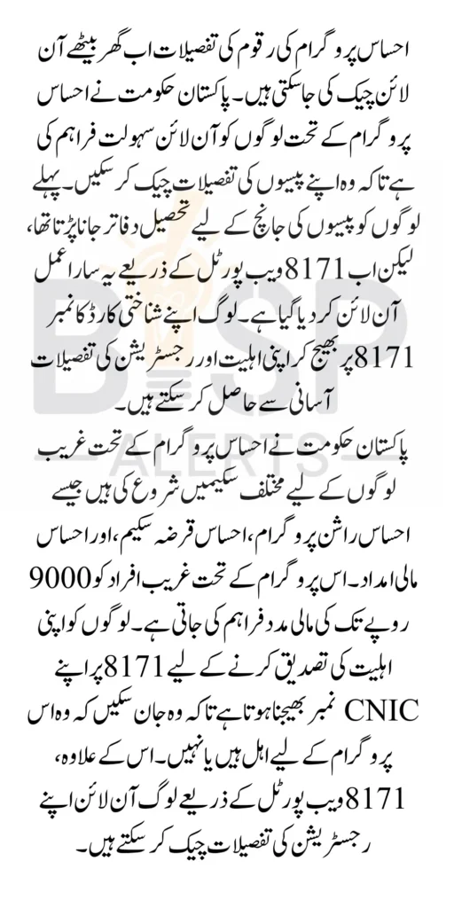 You can check your money details online at home in the Ehsaas program. Ehsaas Program CNIC Check Online 2024 Check Status 8171. The government of Pakistan has announced great news for the people registered in the Ehsaas program. They can check their money online while sitting at home. Earlier, people had to go to the tahsil office established by the government to get the money check.
