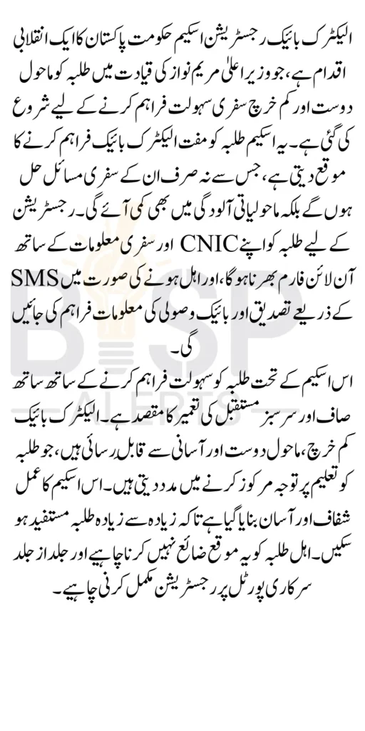 The Electric Bike Scheme is a revolutionary program designed to promote clean energy and reduce transportation challenges for students in Pakistan. With the increasing cost of fuel and environmental concerns, this initiative offers an economical and green solution. Maryam Nawaz has emphasized making the registration process simple and accessible, allowing students to apply for electric bikes from the comfort of their homes.