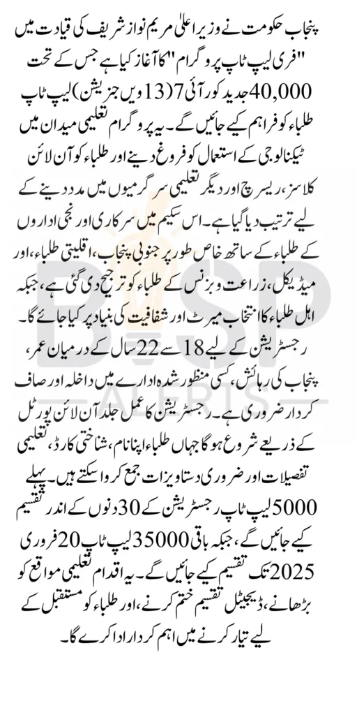 Free Laptop Program for Punjab Students The Punjab government, under the leadership of Chief Minister Maryam Nawaz Sharif, has launched a revolutionary initiative called the Free Laptop Program. As part of this program, 40,000 Core i7 13th Generation laptops will be distributed to students across Punjab’s universities and colleges. This program aims to bridge the digital divide, empower students with modern technology, and support them in their academic endeavors.