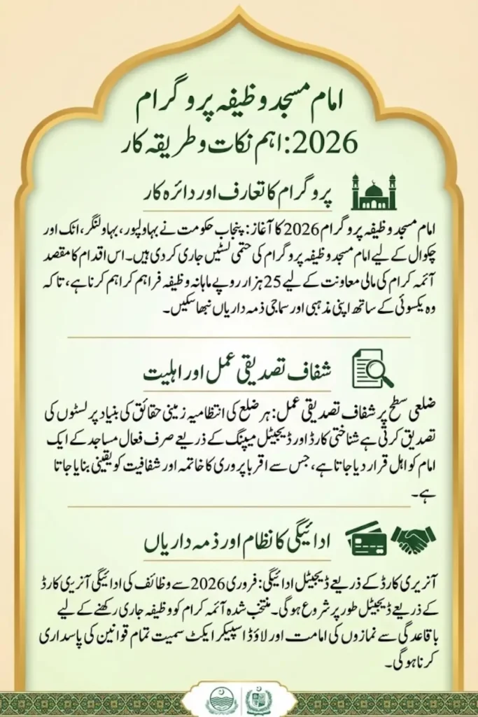 The Imam Masjid Wazifa Selected Candidate List 2026 for Bahawalpur, Bahawalnagar, Attock, and Chakwal represents a meaningful step toward transparency, dignity, and financial security for mosque imams. With district-wise verification and a digital payment system, the program minimizes misuse and ensures timely support.