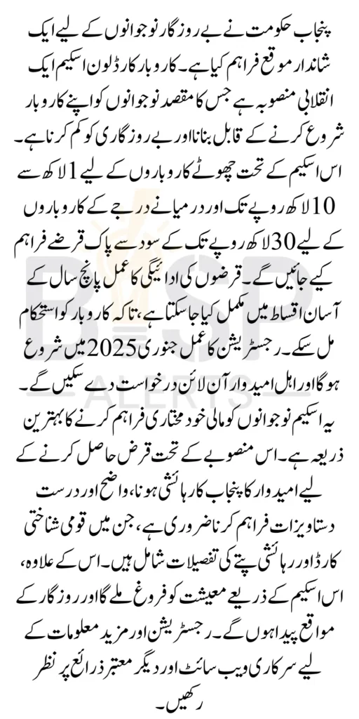 Karobar Card Loan Scheme The Punjab government has introduced an incredible opportunity for the youth of the province. The Karobar Card Loan Scheme is a groundbreaking initiative aimed at reducing unemployment by empowering individuals to start their own businesses. Punjab Chief Minister Maryam Nawaz Sharif has emphasized her commitment to making this scheme accessible to all unemployed youth, ensuring economic progress and sustainable development in the region.