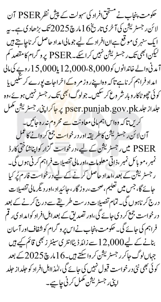 PSER Online Registration Date Increase Punjab Government has extended the PSER Online Registration 2025 deadline until 16 March 2025. This is a golden opportunity for deserving individuals to secure financial assistance under the Punjab Socio-Economic Registry PSER program. If you haven’t applied yet, this is your final chance to benefit from this crucial relief initiative designed to support low-income families.