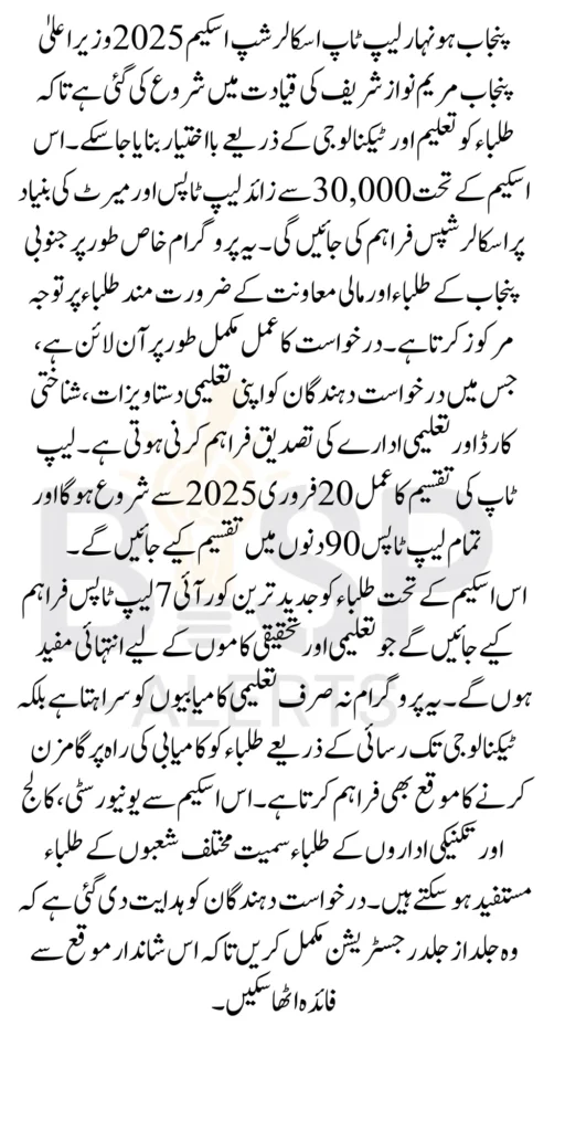 Punjab Honhar Laptop Scholarship Scheme 2025 Punjab government, under the leadership of Chief Minister Maryam Nawaz Sharif, has launched the Punjab Honhar Laptop Scholarship Scheme 2025 to empower students with technology and education. The initiative was announced on January 23, 2025, and is designed to provide laptops and scholarships to deserving students across the province. In this article, in This article guide you through all the important details of this program, including how to apply for the scholarship and how to benefit from this fantastic opportunity.